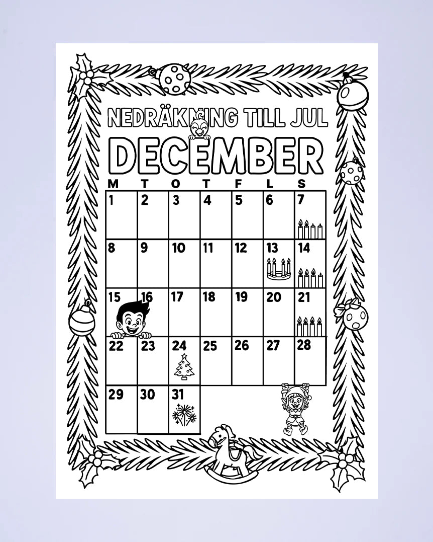 A calendar for the entire month of December with Christmas illustrations to color and craft with daily. -