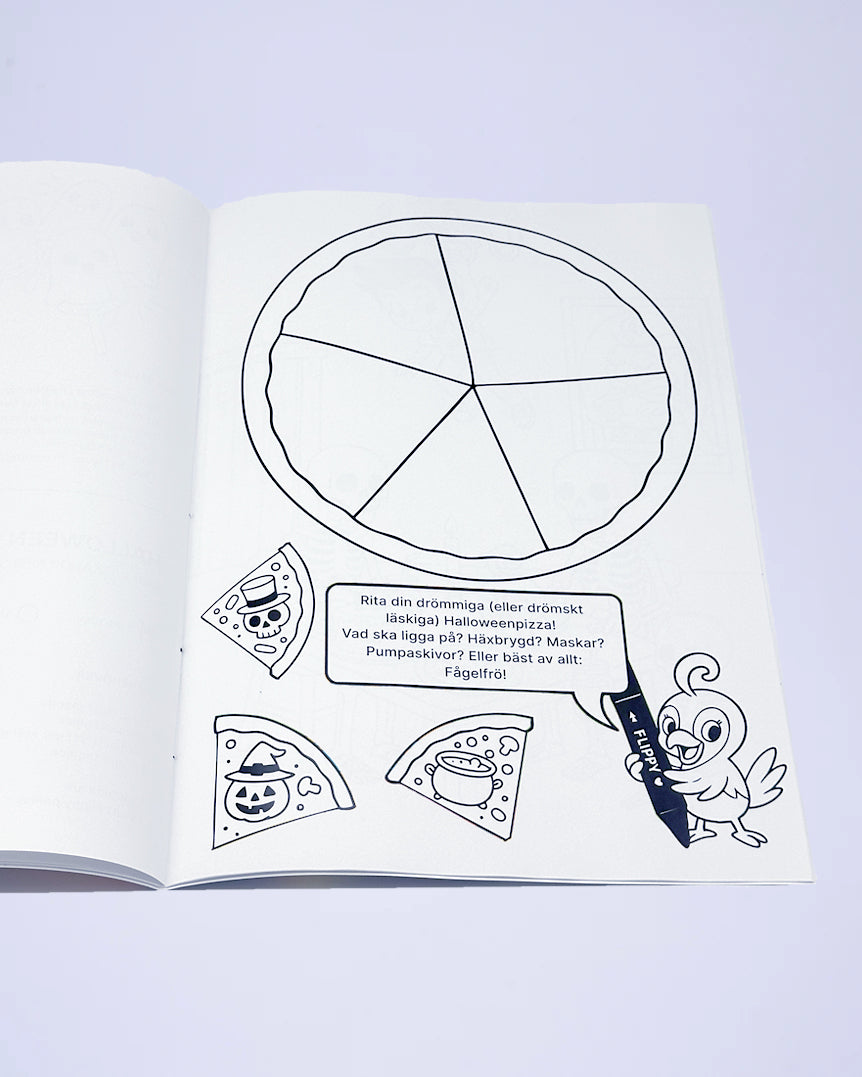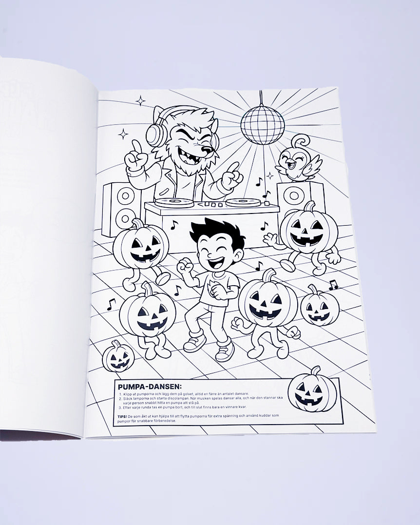 I boken hittar du bland annat Pumpa-dansen, MEGA popcornhanden, Spökglassen och många fler Halloween-inspirerade överraskningar att färglägga och pyssla med.
